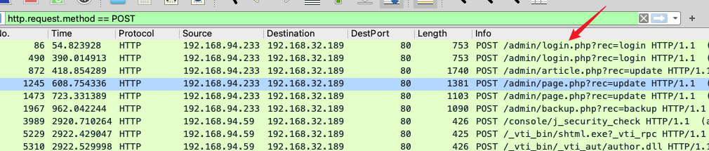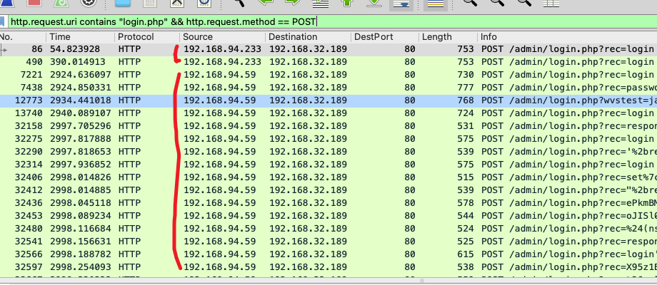 http.request.method == POST && http.request.uri contains "login"。可以看到有好多条尝试登录的数据包,估计都是在暴力破解。即使再加上