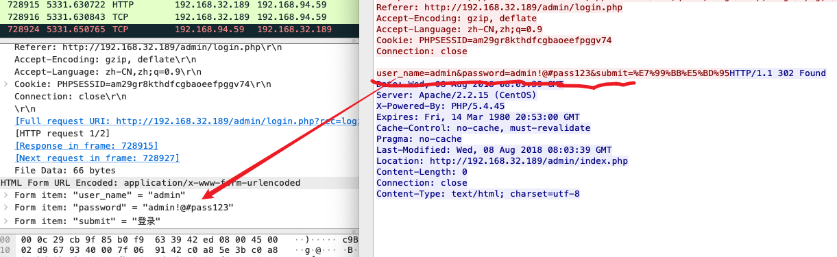 - 选中包 [728915],进行追踪 tcp 流。因为追踪流窗口显示的信息是连在一起的看着不清晰。所以可以在追踪流窗口中点击红色所代表的请求包,然后在主窗口的包详情面板中,就能看到这个黑客发起的登录请求啦!😎