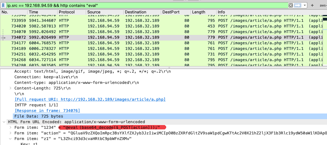 ip.src == 192.168.94.59 && http contains "eval" - 然后我们看到筛选出来好多 /image/article/a.php 的访问请求,看一下它的包详情,妥妥的一句话木马。