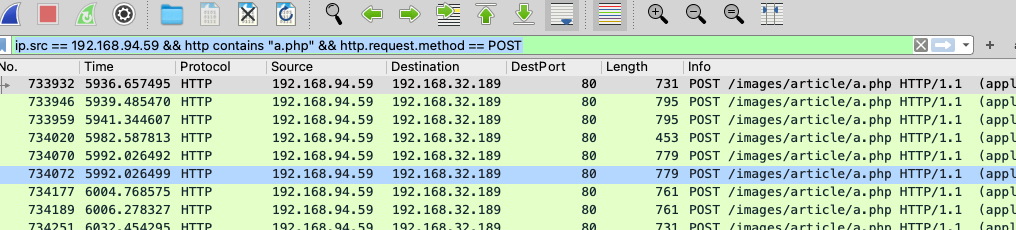 ip.src == 192.168.94.59 && http contains "a.php" && http.request.method == POST,因为上传文件,肯定是用 POST 方法。但很不幸过滤出来的还是只有调用 webshell 的记录。