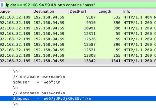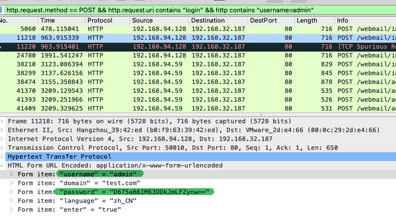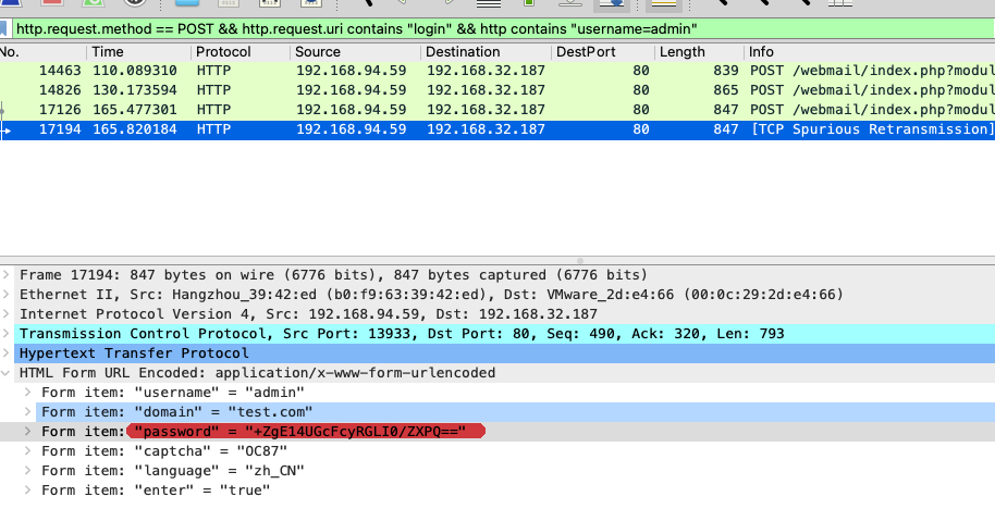 ip.dst == 192.168.94.59 && http contains pass。但是这个指令筛选出来的还是有很多条数据,有一个小花招就是,你可以直接看最后一条数据包。因为黑客如果成功拿到想要的信息了,后面就不会再进行类似尝试了,所以最后一条数据有很大可能就是黑客成功的那一条。
