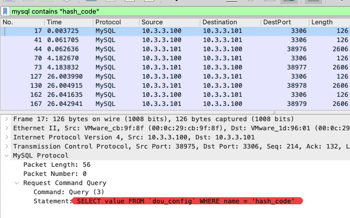 mysql contains "hash_code"。发现在数据包 [17] 中,有一条去数据库中查找 hash_code 值的语句。那么其一定在这个请求包的响应中了。