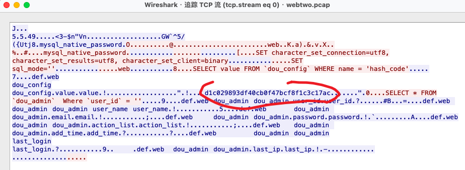 - 这题应该使用到 webtwo.pcap 捕获文件。里面有大量的 mysql 数据流。