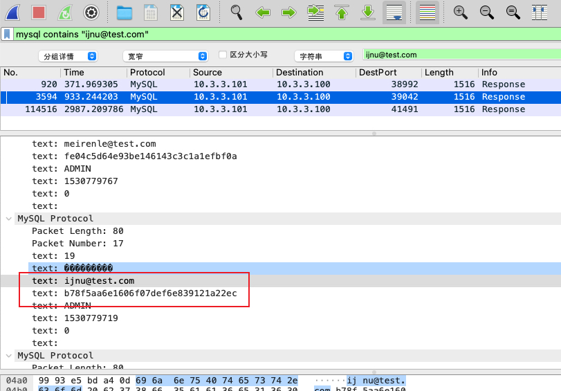 - 看一下包的详情,发现里面就是 mysql 返回的用户信息列表。按「ctrl + F」搜索 ijnu 关键字,找到该帐号。