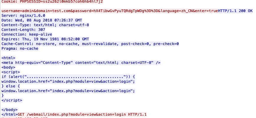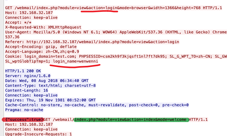 /webmail/index.php?module=view&action=login&mode=browser。(PS:我有一点不解的是,他这次请求中并没有夹带密码信息啊,只有 cookie 中的 PHPSESSID 与 login_name。那么可能是用 cookie 登录的。但是他上次不是退出登录了嘛!帐号退出不是要清 cookie 跟 session 嘛!他怎么还有有效 cookie!所以我怀疑他这次登录其实使用的是客户端 ssl 证书登录,因为可以看到登录页面的源代码中包含 “ssl login” 的代码。)