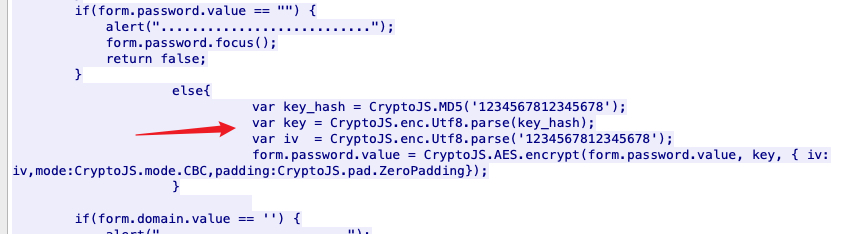 /webmail/index.php?module=view&action=index&mode=welcome。另外,在追踪流中还会发现登录页面的源码泄漏了密码的前端加密逻辑。采用 AES-CBC 加密模式,填充为 ZeroPadding,偏移量为