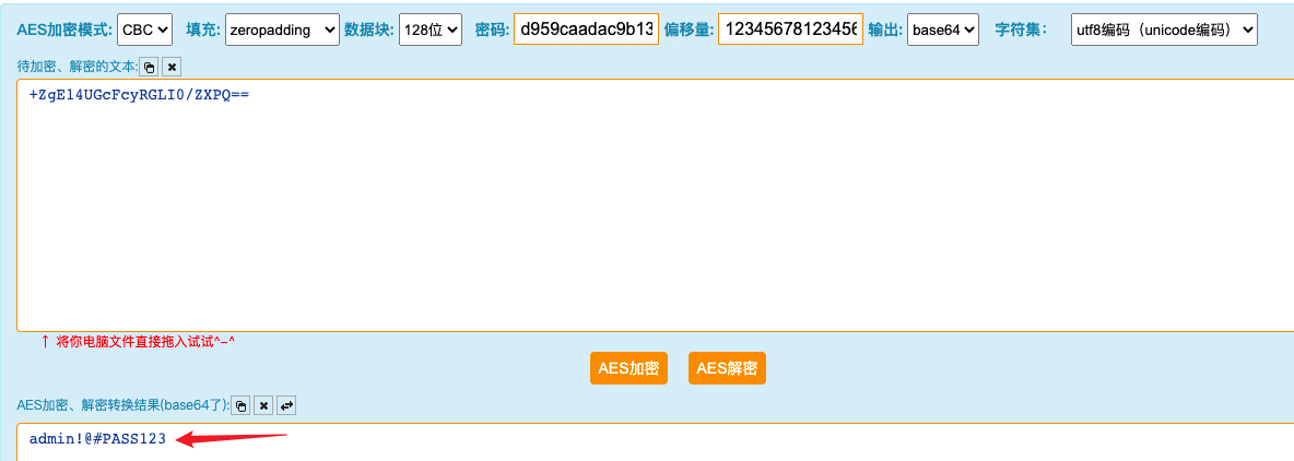+ZgE14UGcFcyRGLI0/ZXPQ==。然后根据之前泄漏的前端加密逻辑进行解密,找一个在线的 AES 解密网站http://tool.chacuo.net/cryptaes。(这里注意,它在前端 AES 加密用到的 key 是小写的md5)
