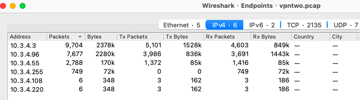 vpntwo.pcap 文件里都是内网 ip,其中数据包最多的是 10.3.4.3(估计就是黑客获得的 vpn 地址了)。