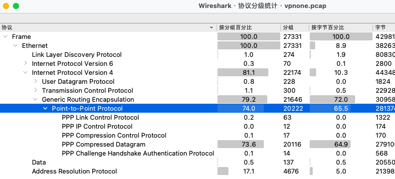 使用 Wireshark 统计协议分级的功能。发现黑客使用的是 pptp 协议(好像是说 ppp 是 pptp 的底层协议,我没搞清楚 =。=)