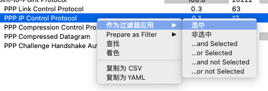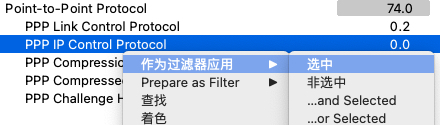 - 然后我查到的,ppp 协议协商 ip 地址的过程是 ppp ipcp 协议。右键选中”PPP IP Control Protocol”协议并过滤。