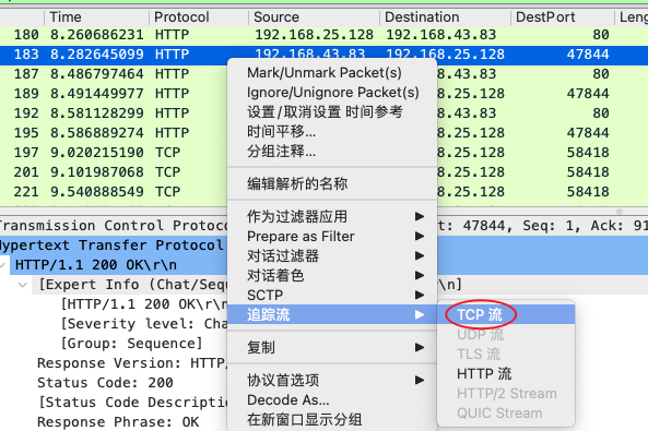 在数据包列表面板,右键点击一条想要追踪的数据包,选择 “追踪流 – TCP 流”。就会弹出一个新窗口,列出了跟该数据包上下文相关的所有数据流。