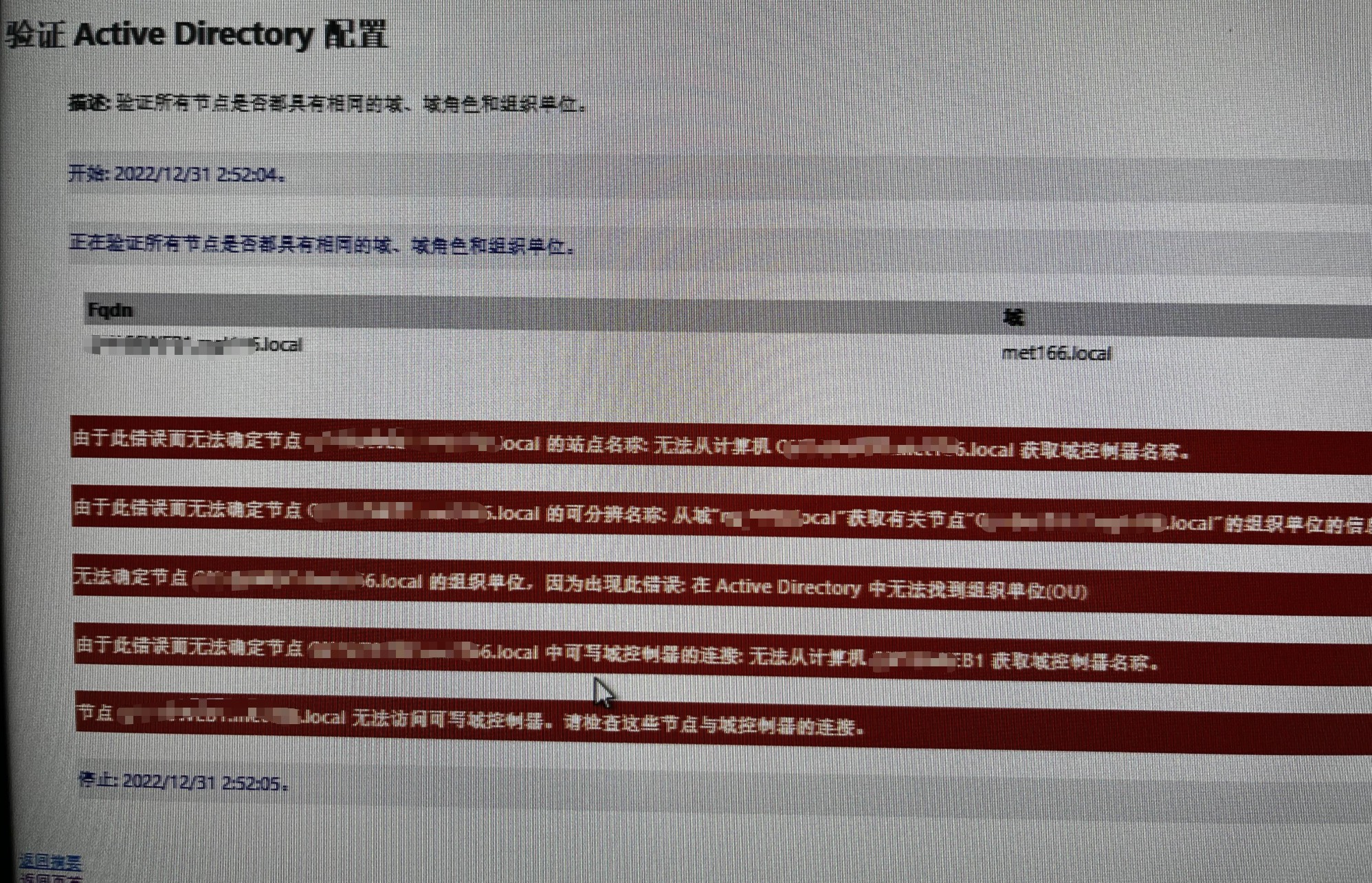 (3)使用 “故障转移群集管理器” 的 “验证群集” 功能(假设恰好这台主机能连上故障转移群集),查看报告发现 “存储”、“群集配置”、“系统配置” 模块下存在大量报错。其中最重要的错误是 “系统配置 – 验证 Active Directory 配置” 报错提示 “请检查这些节点与域控制器的连接”。