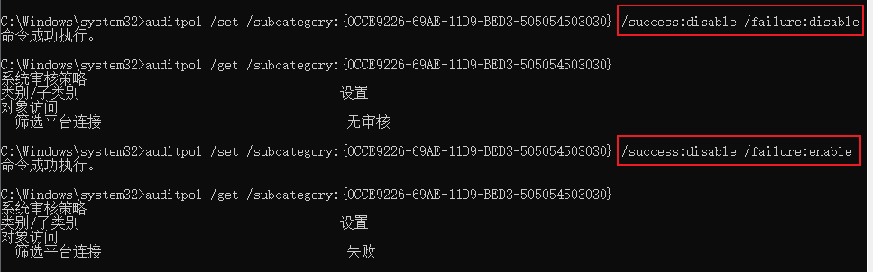 使用如下命令将 Filtering Platform Connection 的成功日志禁用(失败日志保留):