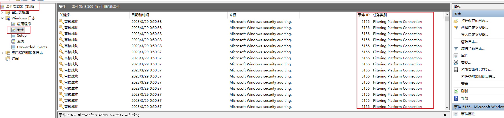 打开 Windows 系统的 “事件查看器”,在安全日志中,发现有超多事件 ID = 5156, 任务类别 = “Filtering Platform Connection” 的审核成功日志。估计是这个审核日志太多导致安全日志文件(Security.evtx)频繁写满然后被归档。