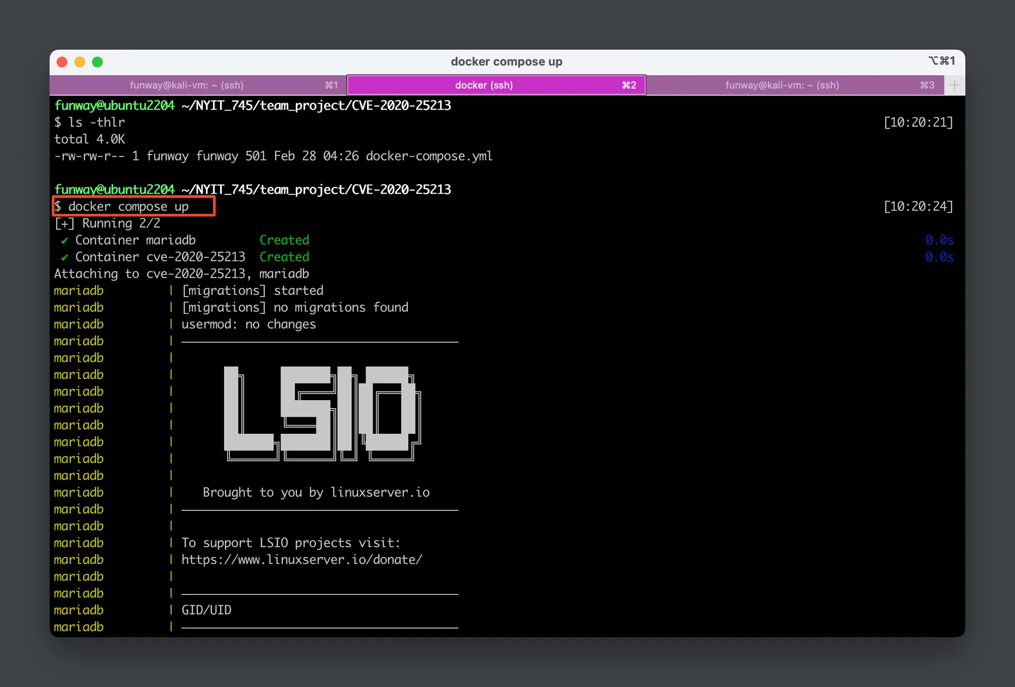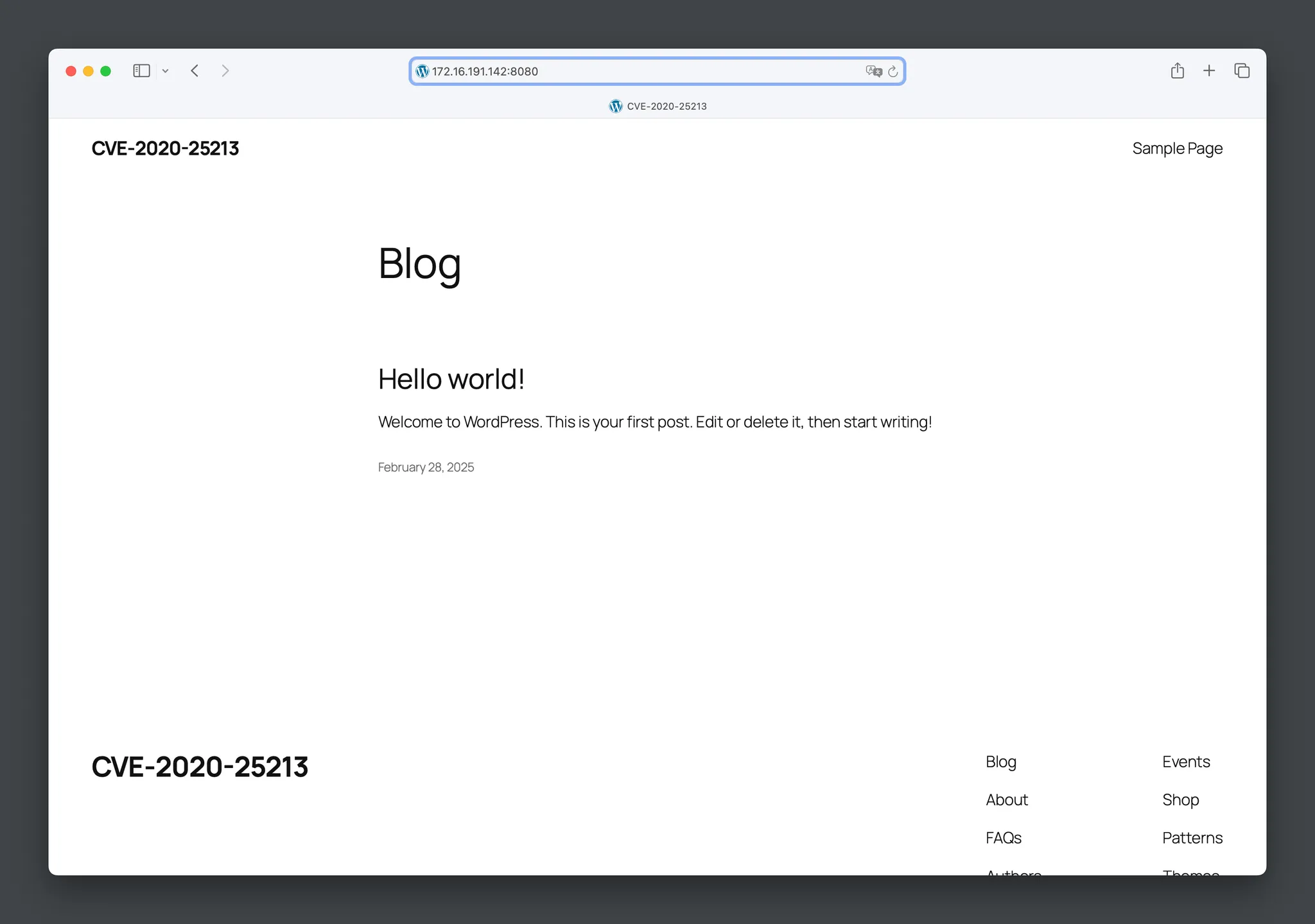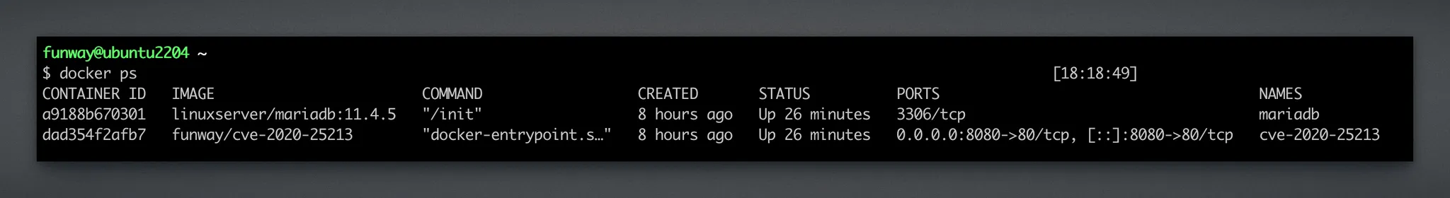 - A WordPress container named cve-2020-25213, hosts the vulnerable WordPress website and exposes the WordPress site on port 8080 of the host machine.