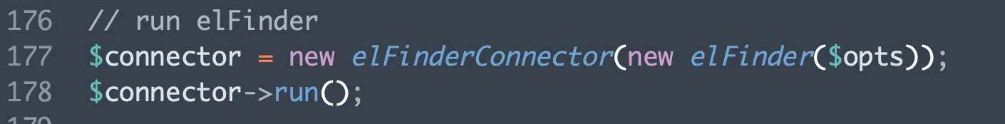 elFinderConnector.class.php, within theelFinderConnector->run()method, the$this->elFinder->exec($cmd, $args)method is called.