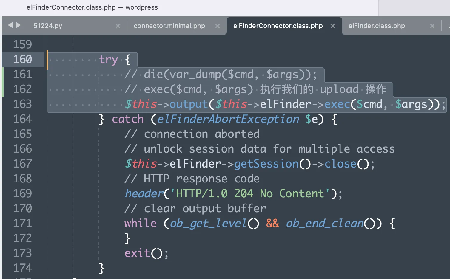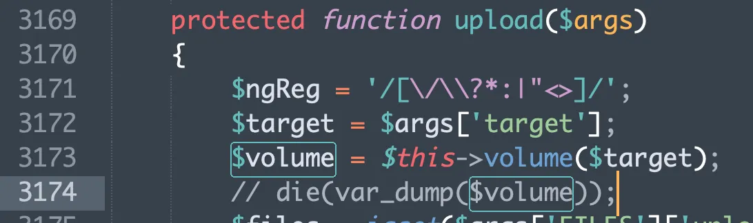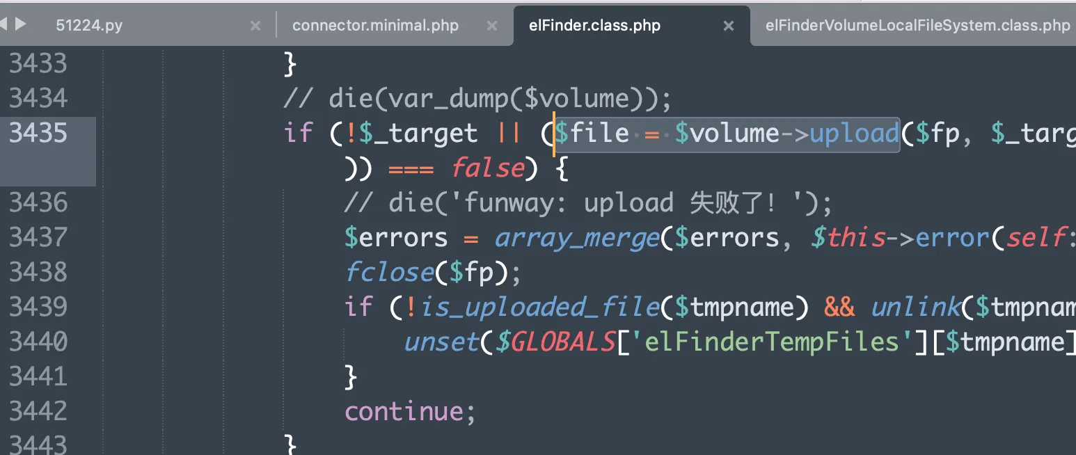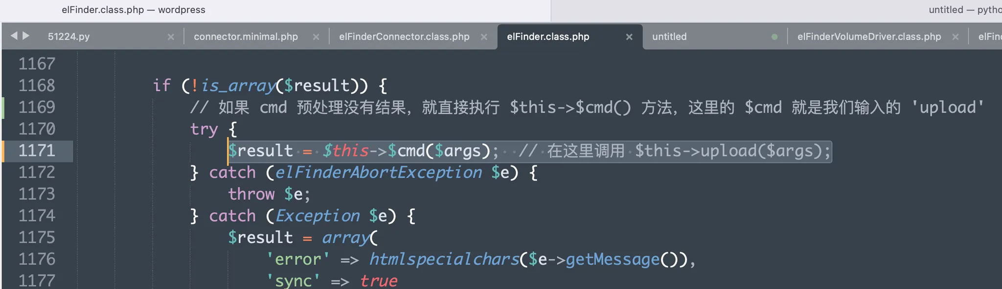 elFinder.class.phpfile, inside theelFinder->exec()method, the$this->$cmd($args)method is called. Since$cmdis replaced withupload, it’s equivalent to calling$this->upload($args).