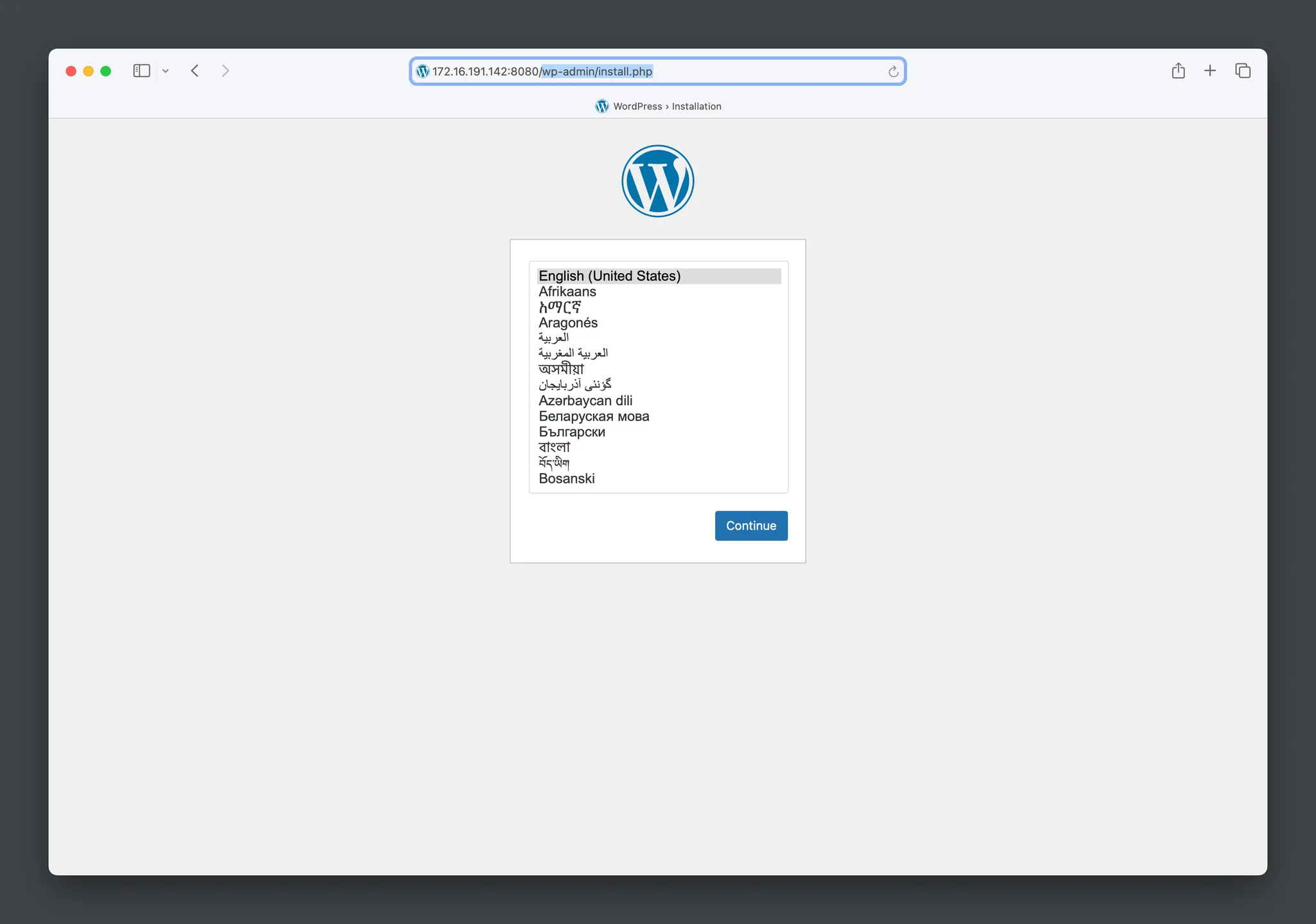 - If this is your first time accessing the website, WordPress will automatically redirect you to the initialization page, as shown below. You can either complete the setup or skip it—this will not affect our experiment. Our WordPress Docker image has already been pre-installed with the vulnerable WP-File-Manager plugin.