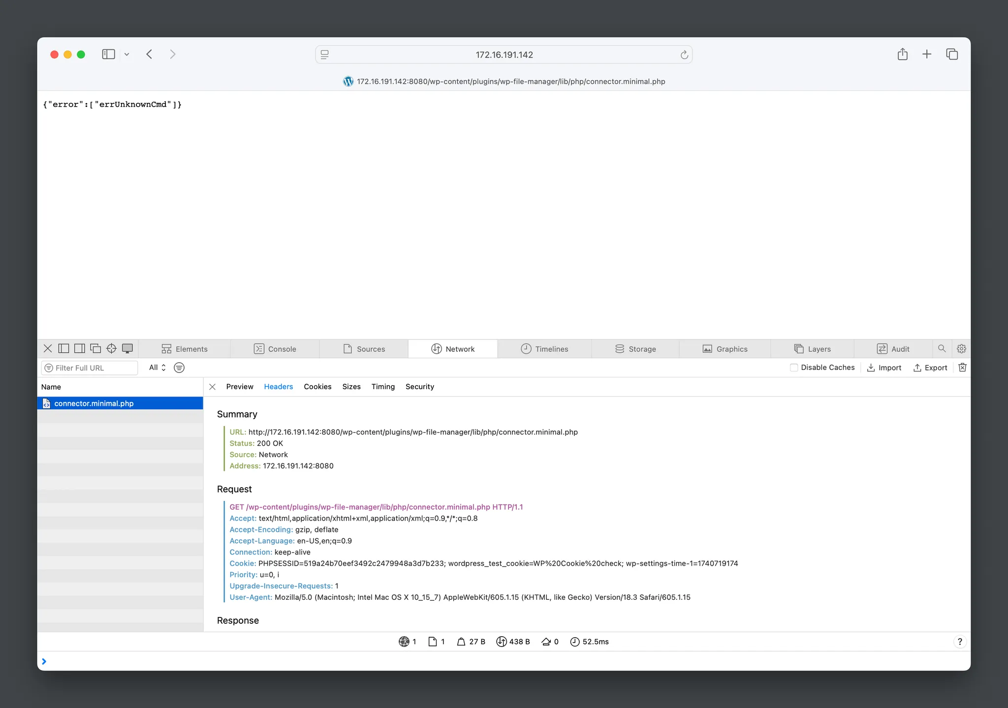 At this stage, the goal is to verify the existence of the vulnerable endpoint by accessing the following URL:http://target-domain/wp-content/plugins/wp-file-manager/lib/php/connector.minimal.php