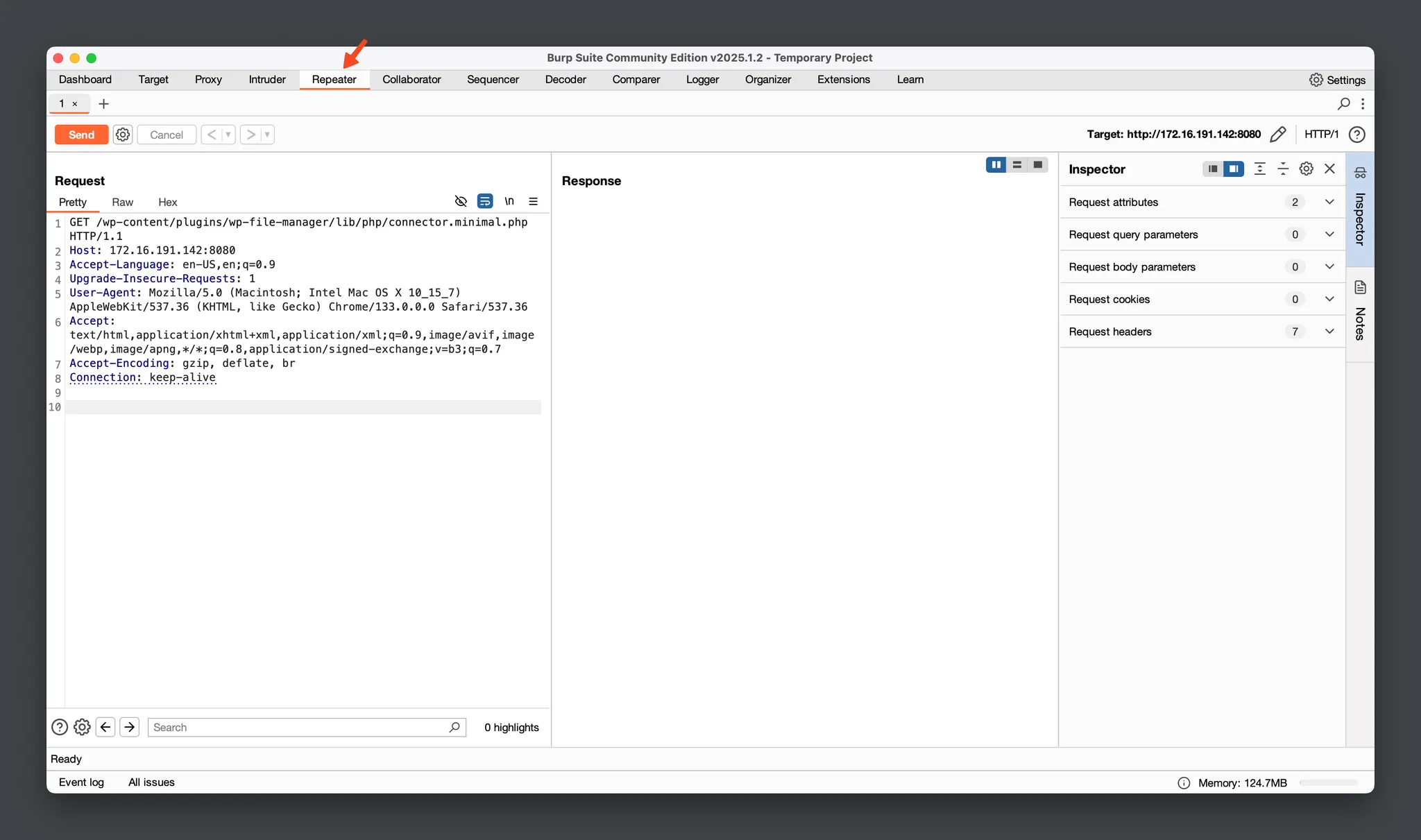 connector.minimal.phpand select “Send to Repeater”. - Click the Repeater tab, where you can modify the HTTP request and resend it.