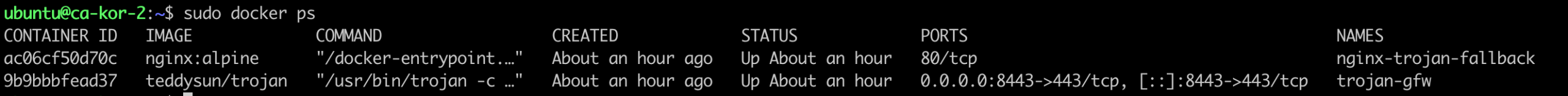 使用 sudo docker ps 检查容器状态: